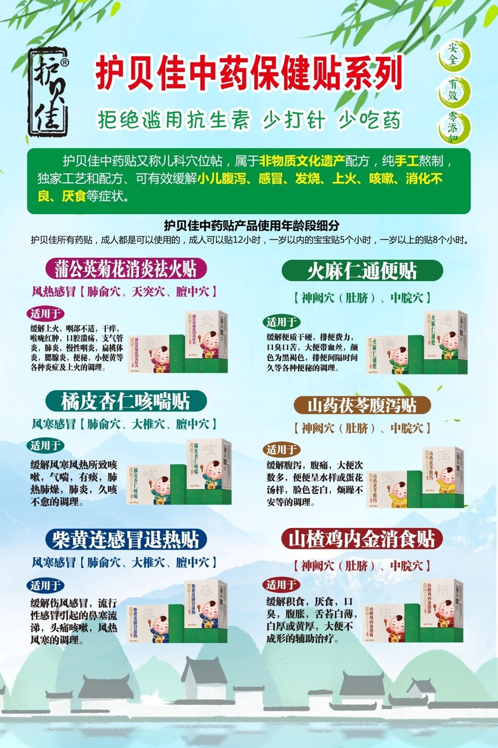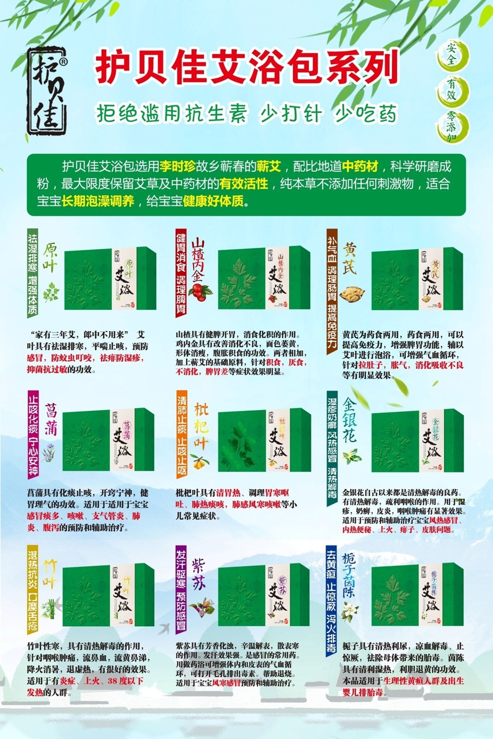 護(hù)貝佳貝愛——來自大自然的嬰幼兒健康護(hù)理品牌,以久負(fù)盛名的蘄艾和天然植物中草藥為原料,秉承“天然”、“安全”、“有效“、“零添加”的制造理念,倡導(dǎo)“少打針,少吃藥,杜絕抗生素”的健康理念,真正實現(xiàn)“健康育兒”的愿景,全面呵護(hù)寶寶的健康成長。