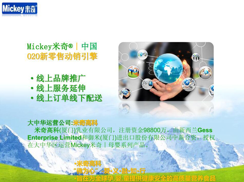 米奇高科(廈門)乳業(yè)有限公司注冊資金98800萬,由新西蘭Gess Enterprise Limited和御米(廈門)進(jìn)出口股份有限公司中外合資,授權(quán)在大中華區(qū)運(yùn)營Mickey米奇母嬰系列產(chǎn)品。