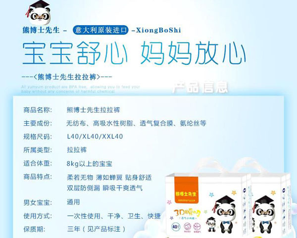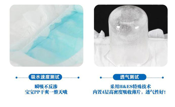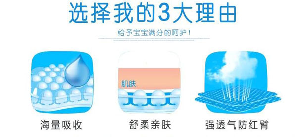 高分子吸收芯體,選用特殊復合芯體,吸收更快、更強韌、不易斷層。3D立體雙層防護,加強防漏能力能更好阻隔尿液外溢。雙層舒爽芯,進口住友+三大雅高分子完美配比,瞬間吸收、牢固鎖水。親膚透氣底膜,良好的透氣性的PE膜,形成有效的縱向?qū)α骺焖賹С鰪U氣和濕氣,沒有紅屁屁,讓寶寶的皮膚盡情的呼吸。360°雙層立體防側(cè)漏,寶寶怎么動都不怕。