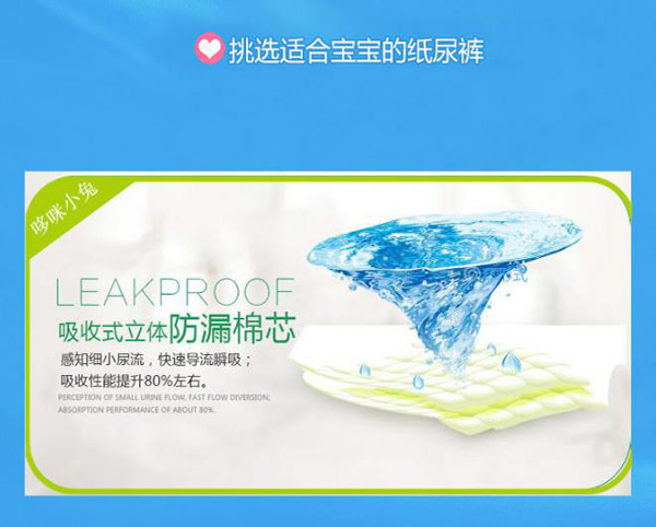 柔薄芯層結(jié)構(gòu),采用全芯高科技結(jié)構(gòu)設(shè)計(jì)、薄軟透氣、零接觸摩擦感、不起坨、不斷層、輕輕的呵護(hù),給寶寶體貼的愛(ài)。綿柔無(wú)紡布透氣底膜,及時(shí)散發(fā)悶熱濕氣,減少寶寶皮膚的刺激及傷害。全新3D打孔大珍珠面層,瞬間吸收,加倍干爽,連通吸收芯成(多層鎖水)系統(tǒng),有效吸收和鎖住更多尿液,讓寶寶屁屁更加干爽。雙重防漏立體設(shè)計(jì),舒適柔軟貼合腿部,防止尿尿往兩邊側(cè)漏,給寶寶自由自在,盡情活動(dòng)的舒爽空間。人性化合身曲線剪裁,專為中國(guó)寶寶設(shè)計(jì)的合身檔剪裁,更加貼合寶寶,腿部及臀部曲線,減少腿部摩擦與壓力。背部彈性腰圍貼身防后漏,無(wú)論寶寶坐、騎、爬等,大環(huán)腰彈性腰圍能自然伸縮,貼身服帖。