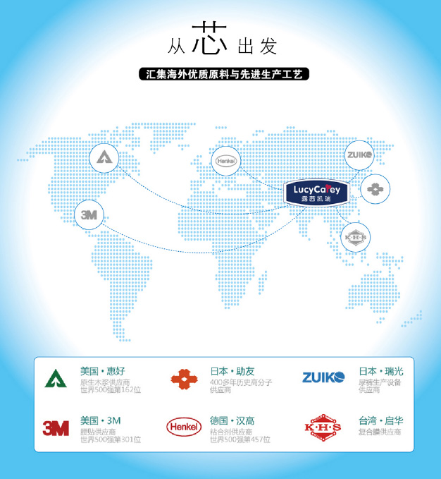 LUCYCAREY露茜凱瑞紙尿褲選用全球頂尖供應商的紙尿褲原材料:住友、三大雅高分子吸水材料;美國3M魔術貼;德國萊卡松緊帶;美國進口原生木漿;德國漢高粘合劑;美國、日本進口無紡布;進口超柔軟透氣底膜等。另外,全世界zui先進的全自動紙尿褲生產(chǎn)線,年產(chǎn)銷數(shù)億片紙尿褲的成熟的生產(chǎn)制造團隊,確保產(chǎn)品高品質。