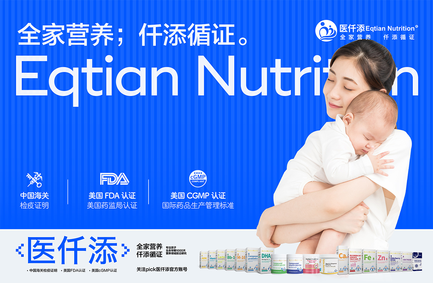 Eqtian Nutrition醫(yī)仟添系列產(chǎn)品均來自美國EQTIAN NUTRITION INC.企業(yè)生產(chǎn),堅持采用天然原材料加工 ,嚴(yán)格把關(guān)每一道生產(chǎn)過程。產(chǎn)品都通過了美國權(quán)威FDA認(rèn)證,按照美國cGMP(國際藥品生產(chǎn)管理標(biāo)準(zhǔn))條例生產(chǎn)。醫(yī)仟添自成立以來,一直致力于對營養(yǎng)學(xué)與健康食品臨床研究與開發(fā)方面的努力探索,以科學(xué)的方式為千萬家庭傳播愛與健康,這是企業(yè)品牌文化使然,健康婦幼,營養(yǎng)先行。讓醫(yī)仟添守護(hù)每一個中國家庭的營養(yǎng)健康。愛之有道,計之深遠(yuǎn)——為孩子,也為自己!