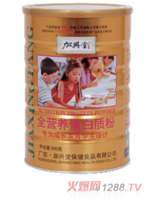 加興堂全營(yíng)養(yǎng)蛋白質(zhì)粉富含人體所需的蛋白質(zhì)、多種 氨基酸、維生素和膳食纖維,沖飲方便、口感好、 易吸收,特別適宜學(xué)生日常補(bǔ)充營(yíng)養(yǎng)飲用。加興堂全營(yíng)養(yǎng)蛋白質(zhì)粉以大豆蛋白粉、豆奶粉、脫脂奶粉、麥芽糊 精、白砂糖、碳酸鈣、氯化鈉、硫酸亞鐵、維生 素A、維生素E,在經(jīng)過特殊的制作工藝精制而成,產(chǎn)品至上市以來,深受人們的喜愛。