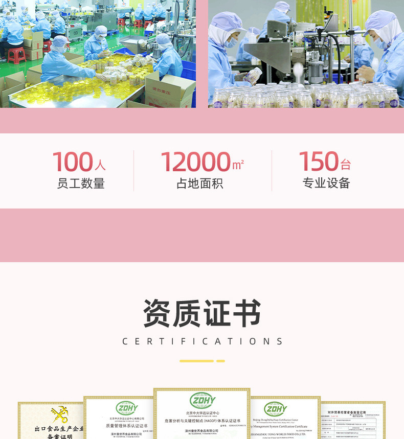 漳州童世界食品有限公司主營一站式代加工OEM業(yè)務(wù),致力于健康兒童食品、功能性代餐食品、凍干燕窩的研發(fā)與生產(chǎn),公司占地面積12000平方米,始終秉承已科技為先導(dǎo)、以先進(jìn)的現(xiàn)代化管理依托、已“顧客滿意第一”為宗旨的經(jīng)營方針、致力發(fā)展成為一家研發(fā)和制造健康、美味、營養(yǎng)的食品企業(yè)。 公司的誠信、實力和產(chǎn)品質(zhì)量獲得業(yè)界的認(rèn)可。歡迎各界朋友蒞臨參觀、指導(dǎo)和業(yè)務(wù)洽談。